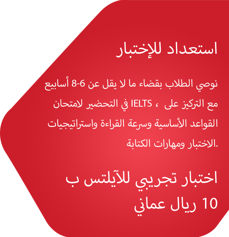 انضم إلى فريقنا في مركز هوثورن لامتحان IELTS وسجل اليوم في دورة التحضير لإختبار IELTS الأكاديمي / العام لفهم الاختبار بشكل أفضل ، وتعلم استراتيجيات إجراء الاختبار ، وتعزيز مهاراتك في القراءة والكتابة والمحادثة في اللغة الإنجليزية. ابدأ رحلتك اليوم للوصول إلى أهدافك ، واحصل على درجة الاختبار التي تحتاجها للنجاح. اضغط هنا
